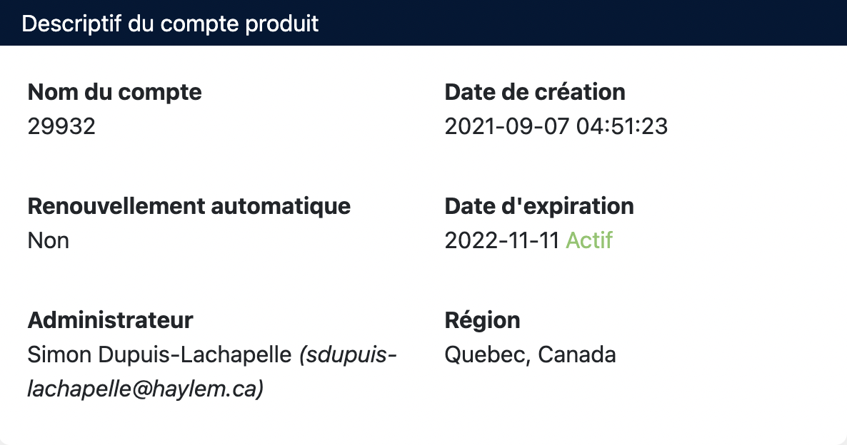 Descriptif du compte produit | Cette section montre les informations générales liées à licence. Tel que démontré sur l'image ci-dessous, il est possible de voir le nom du compte, sa date de création, l'état du renouvellement, la date d'expiration, la personne administrant le compte et la région. |