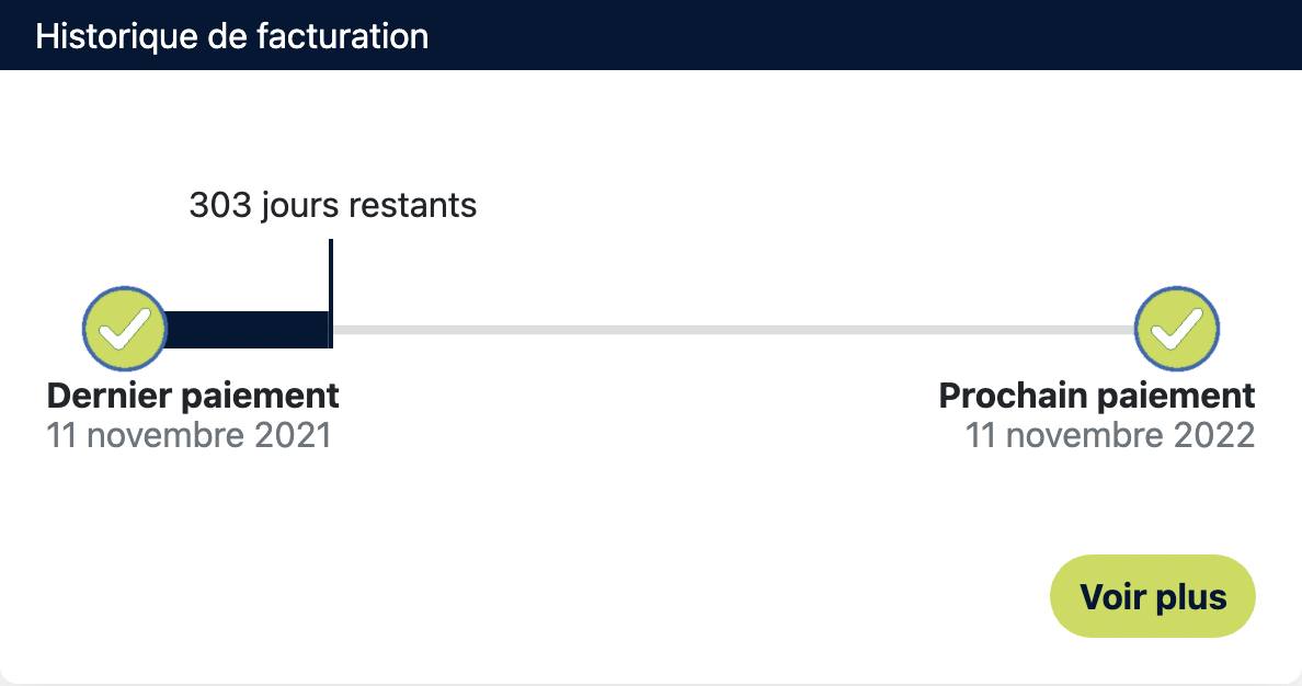 | Historique de facturation | L'historique de facturation affiche le cycle actif et mène également à une liste des achats antérieurs du compte selon la date choisie. |