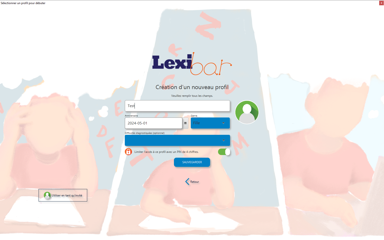 Au cours du processus de création, vous devrez fournir des informations telles que l'âge, le genre et, le cas échéant, les éventuels troubles d'apprentissage.
