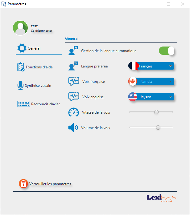 Pour sécuriser les divers paramètres de votre profil utilisateur, comme les différentes fonctions d'aide, la gestion de la langue automatique, la langue préférée, ainsi que la vitesse et le volume de la voix de synthèse, vous devez accéder aux paramètres dans l'onglet "Paramètres" du Lexibar, situé dans la barre des icônes cachées, symbolisée par la lettre A.